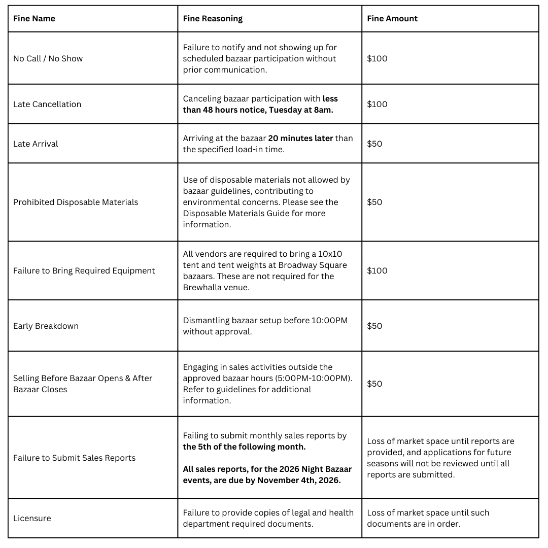 Night Bazaar operates rain or shine, and all enforcement policies remain in effect regardless of weather conditions. Any weather-related absences or early departures must be approved in advance and may be subject to fines or additional enforcement at the discretion of the Bazaar Manager.