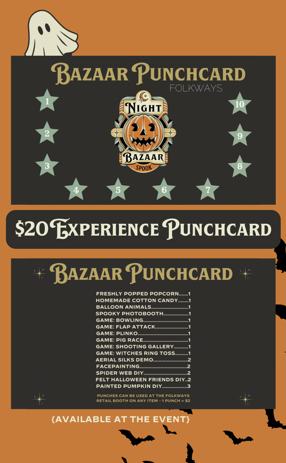 Dive deep into the mesmerizing realm of Night Bazaar where you'll uncover an abundance of hands on experiences. Our punchcards give you access to your choice of activities that match the event’s theme. Punchcards are $20 and can be used at any Night Bazaar event. Don't miss out on the fun! Grab your punchcard at our info booth.