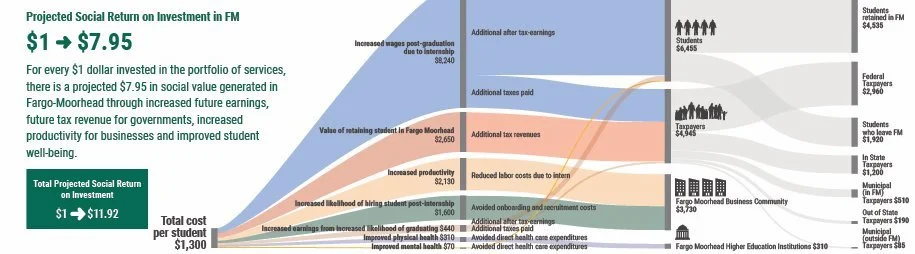 This impact value map shows the total cost required per student for a portfolio of services* that is designed to improve students’ professional development and community engagement and the projected benefits generated by each student served.